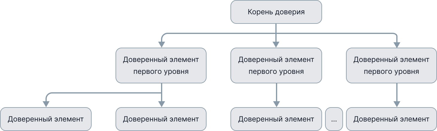 Шаблон предназначен для организации иерархии доверия элементов в системе таким образом, что доверие множеству элементов на каждом уровне иерархии, кроме первого, основывается на последовательности доказательств целостности и аутентичности элементов предыдущего уровня, а также способности элемента (элементов) предыдущего уровня засвидетельствовать целостность и аутентичность элементов следующего уровня.