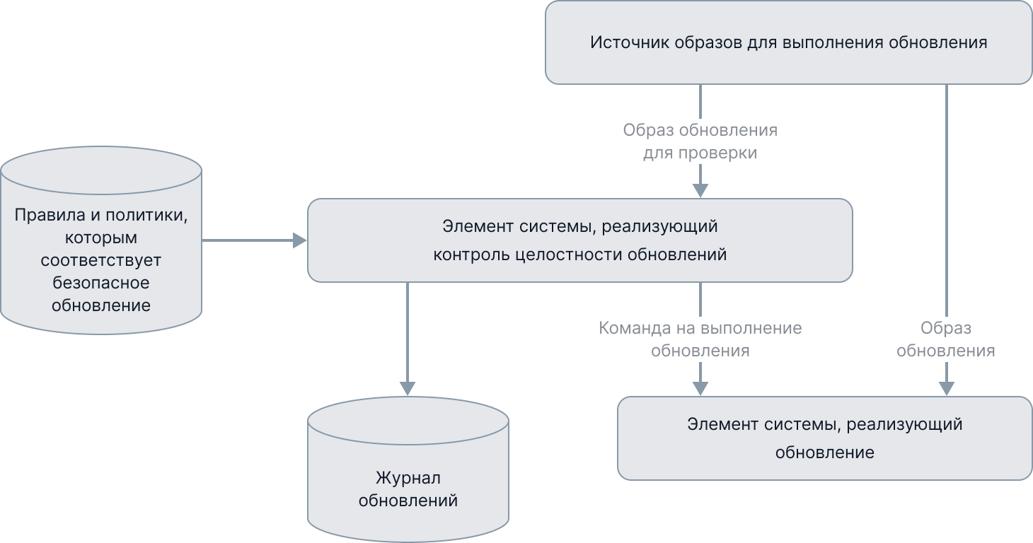 При выполнении обновления элемент системы, реализующий контроль целостности, применяет к полученным данным правила проверки целостности и аутентичности полученных образов для обновления. При успешной проверке элемент, выполняющий обновление, получает сигнал на выполнение, в противном случае (в том числе в случае сбоя при проверке) система остается в безопасном состоянии.