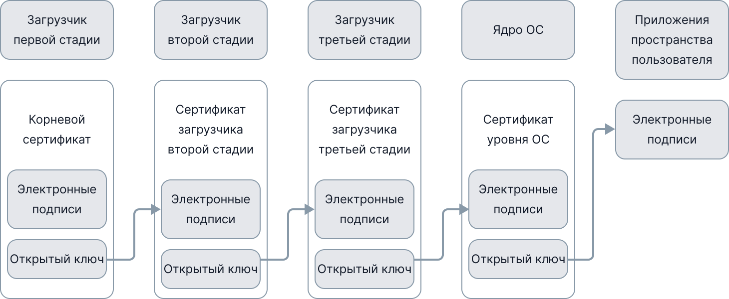 На каждом этапе загрузки операционной системы, начиная от момента подачи питания до полной загрузки и передачи управления пользователю, загрузчик на текущей стадии загрузки проверяет целостность и аутентичность программного кода, используемого на следующей стадии, путем проверки его ЭЦП. Таким образом может гарантироваться, что на каждой стадии загрузки устройства будет происходить проверка аутентичности и целостности исполняемого кода. Будут загружаться только компоненты, подписанные заранее известными сертификатами, хранящимися в доверенном хранилище. У злоумышленника не будет возможности подменить код ни на одной стадии загрузки.