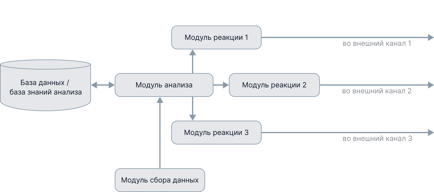 Допустимо использовать не один, а несколько модулей реакции, реализующих связь с внешними системами через одни и те же или различные типы каналов связи (рисунок 6).