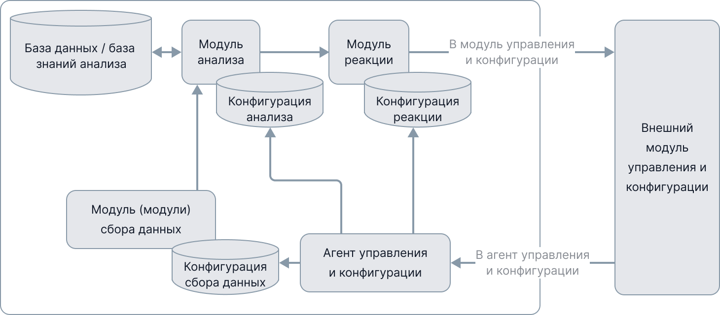 Допустимо реализовывать обратную связь от внешних систем, подключенных через модуль реакции, для переконфигурирования монитора с целью обеспечения его устойчивой работы, а также для корректировки параметров сбора данных и подстройки алгоритмов анализа. Для управления и конфигурирования модулями шаблона вводится дополнительный отдельный модуль — агент управления и конфигурации, действующий внутри шаблона (рисунок 7).