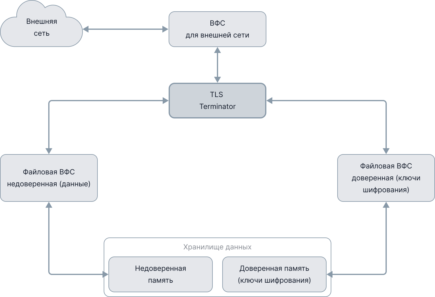 Шаблон основан на реализации другого шаблона проектирования «Разделение потоков данных на уровне драйвера ресурсов» и реализует раздельный доступ к сетевому интерфейсу и к двум разделам файлового хранилища. Один из разделов файлового хранилища предназначен для ключей и других секретов шифрования, второй — для прочих данных, обмен которыми происходит по TLS.
